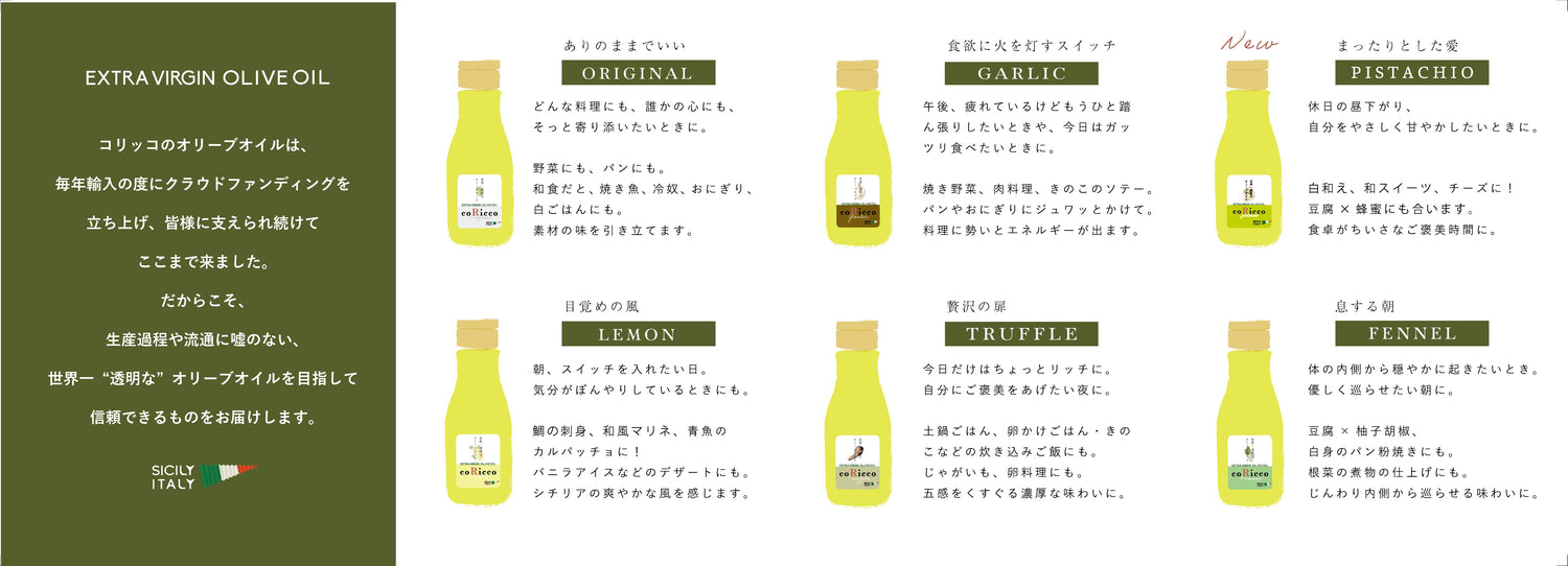 コリッコのオリーブオイルは、シングルオリジン(単一品種単一農園)のオリーブオイルのため、その年のオリーブオイルの味の変化を楽しんでいただけます。